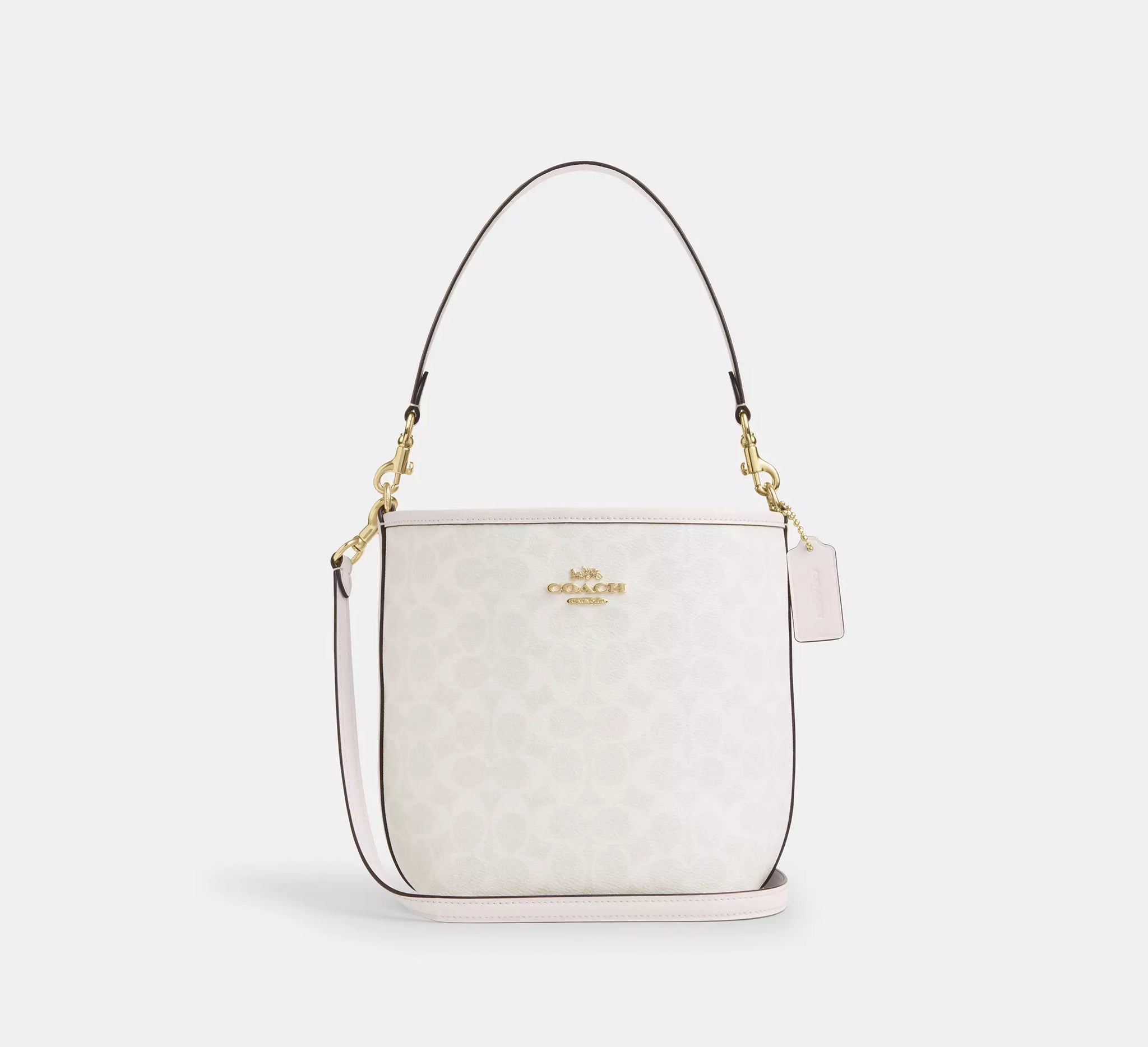 Con un diseño moderno y femenino, la Coach Bucket City en tono blanco signature es la definición de elegancia minimalista. Su forma estructurada tipo cubo la hace perfecta para llevar tus esenciales con estilo y comodidad.