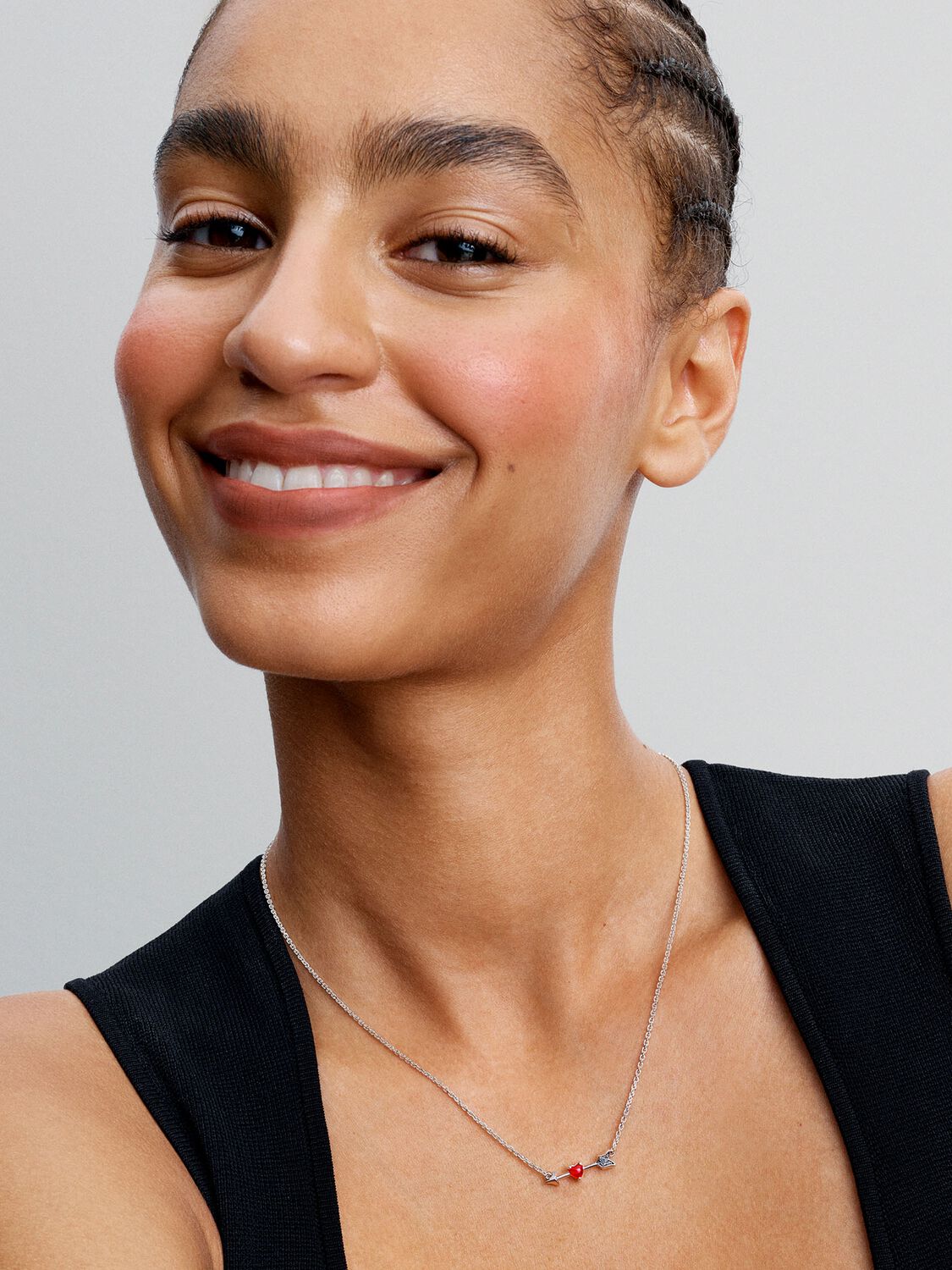 Este simbólico collar combina la artesanía del cristal de Murano hecho a mano con plata de primera ley. Se presenta con los motivos de un corazón y una flecha de Cupido y se ha decorado con brillantes gemas engastadas en pavé- El collar se puede ajustar a la perfección a cualquier escote.