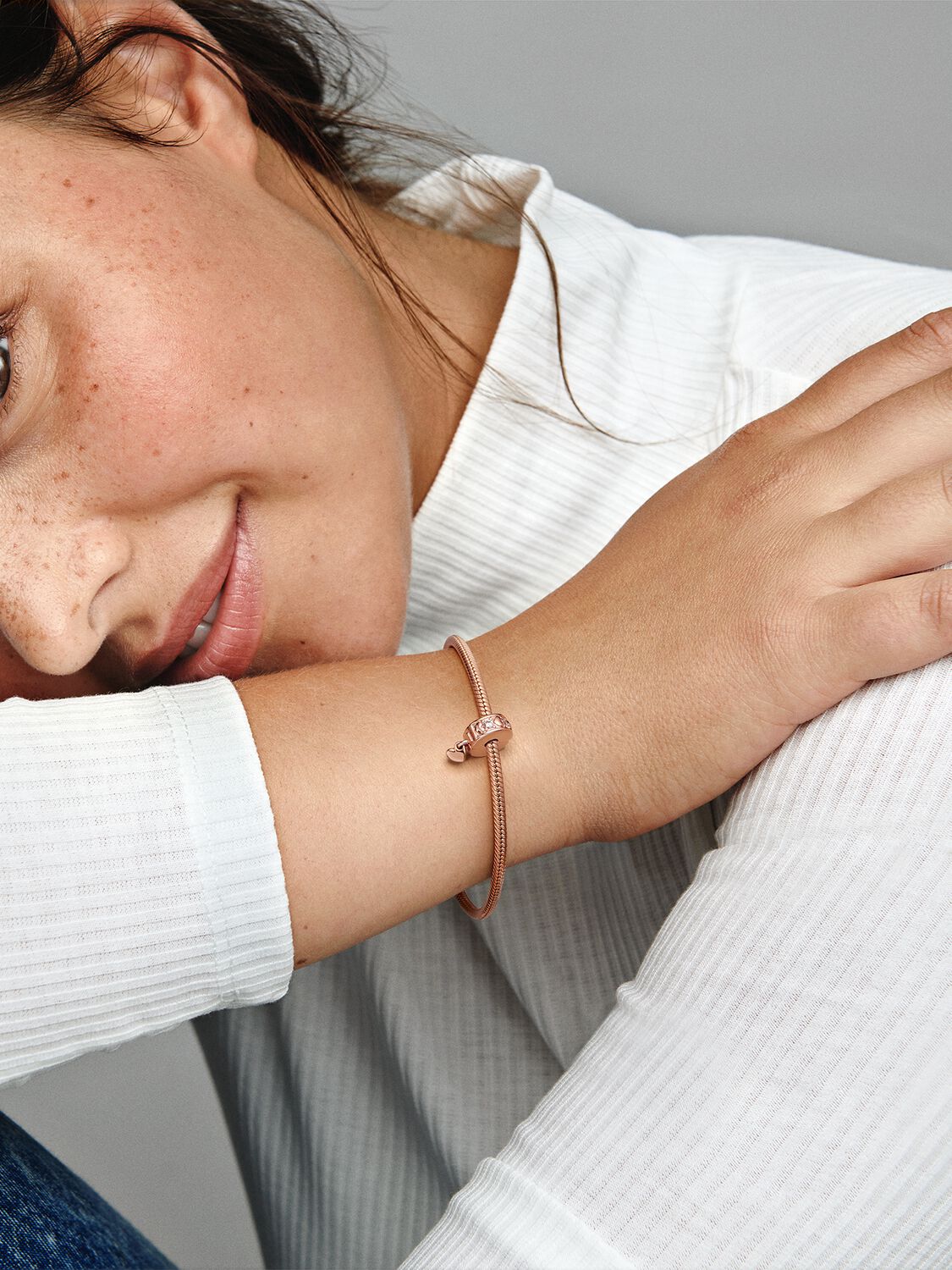 Un elegante clip charm diseñado para proteger y mantener tus charms favoritos en su lugar. Está acabado a mano con baño de oro rosa de 14 K y presenta corazones en relieve con circonitas brillantes, aportando un toque elevado y sofisticado.