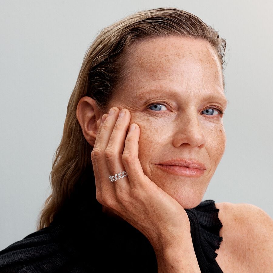Este Anillo Cadena Cubana en Pavé en plata de primera ley redefine la elegancia con sus 84 circonitas cúbicas transparentes con talla brillante y engastes en grano. El sofisticado motivo de la cadena se ha embellecido con tres gemas engastadas en pavé en cada eslabón semicircular que aportan un brillo llamativo. La parte trasera de los eslabones está pulida, lo que garantiza la comodidad, mientras que el logotipo plano aporta un toque elegante. Combínalo con tu outfit de noche favorito o con un traje elegante para crear un look refinado y destacado.