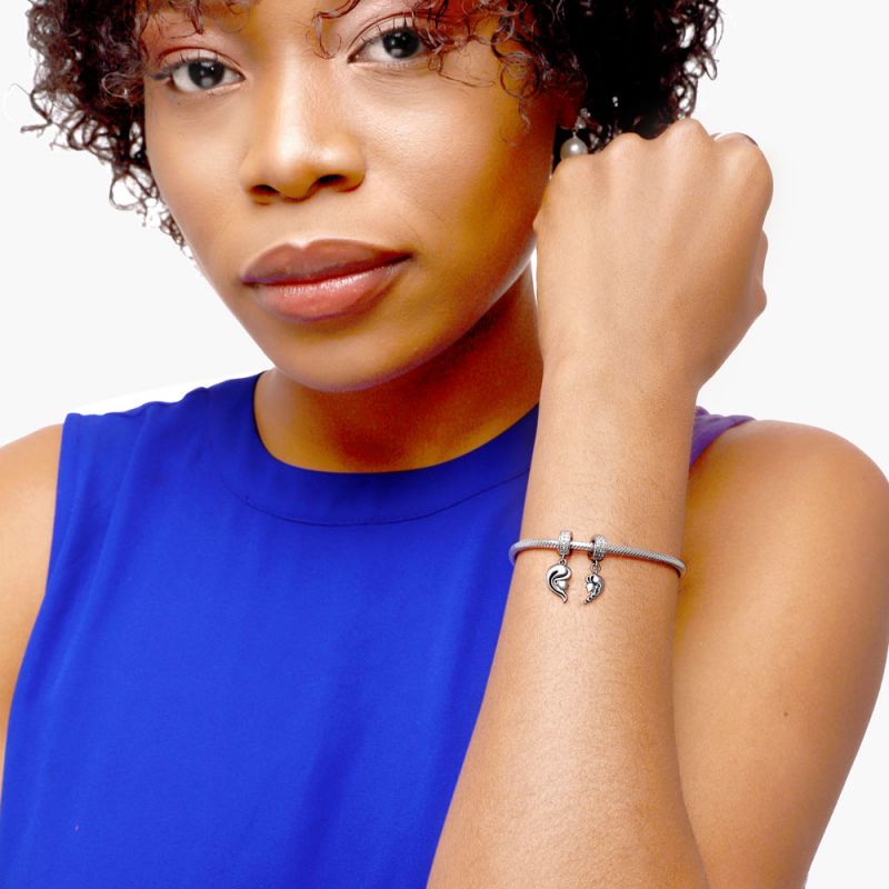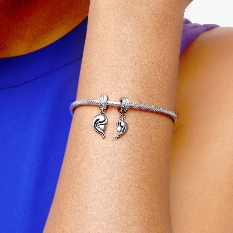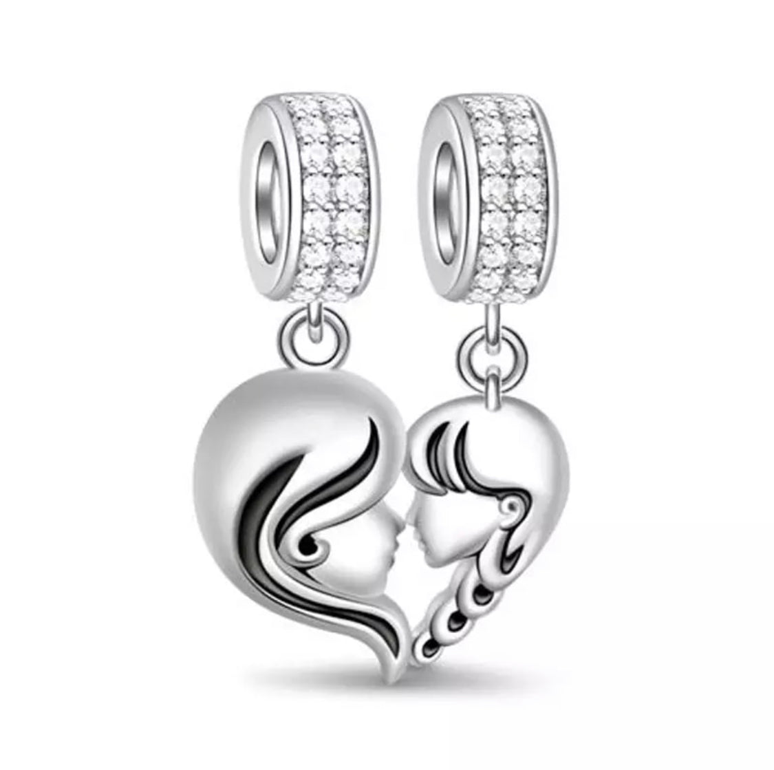 Este juego de colgantes es para madres e hijas. Un colgante tiene la forma de una madre con cabello largo y el otro tiene la forma de una hija con cabello trenzado que cuando se mantienen juntos toma la forma de un corazón.